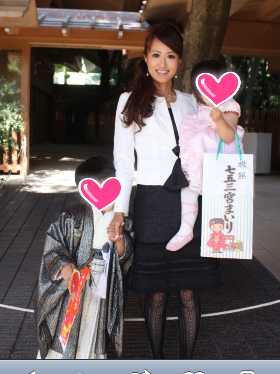 七五三☆ 2012.10.22 昨日は息子の七五三参りをして来ました☆両家の両親もお誘いしてみんなでお参り。 天気も暑いくらいの晴天! 息子は着物を着るのをずっと楽しみにしていて、朝から夕方までの7時間着ていました。食事で着替えさせるつもりが脱ぎたくないといって着物のまま食事。なんだか逞しく感じました(#^.^#) 娘もドレスでおめかし♡3歳の頃はまだ産まれてなかったので初めてみんなでのお参りになりました♡ とても良い思い出になりそうです♬ 二人とも元気にすくすく育ってね(#^.^#) iPhone から送信