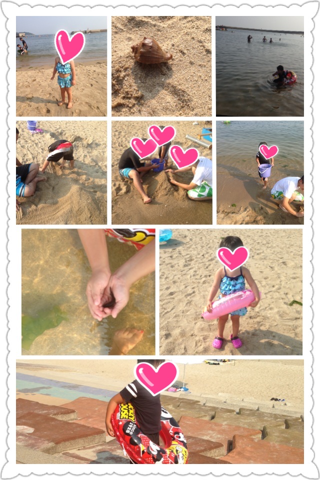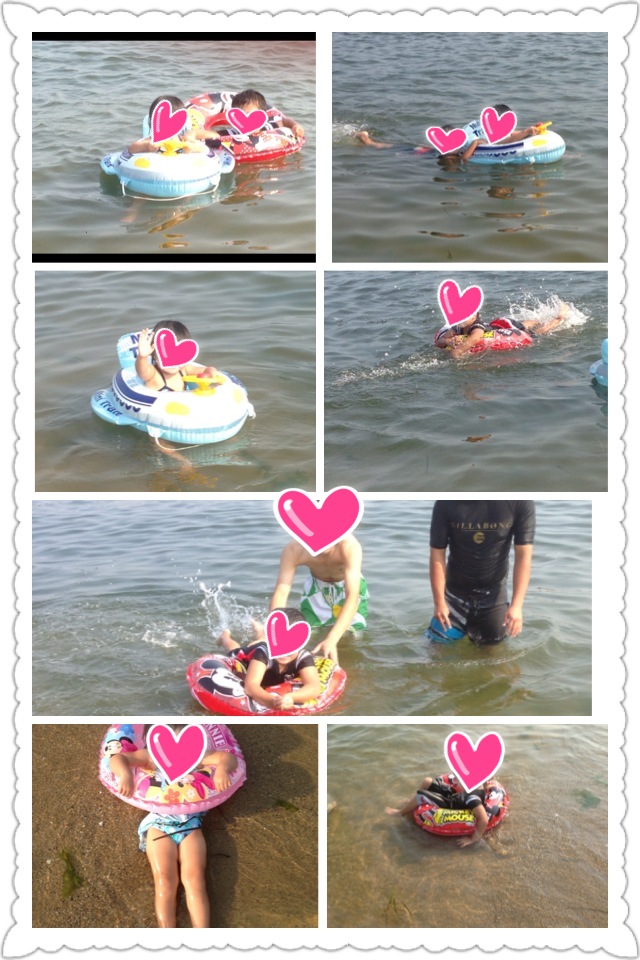 そして、その後は凄く暑くて外に出たくなかったのですが、逆に海に行こうと思いつき、今年初の海に行きました☆娘は海に入るのははじめて!泣くなぁ、嫌がるかなぁと心配してたら、全くで、息子と喜んで海に入ってくれました!浮き輪に入って、ご機嫌。息子とキャッキャッいいながら遊んでます!