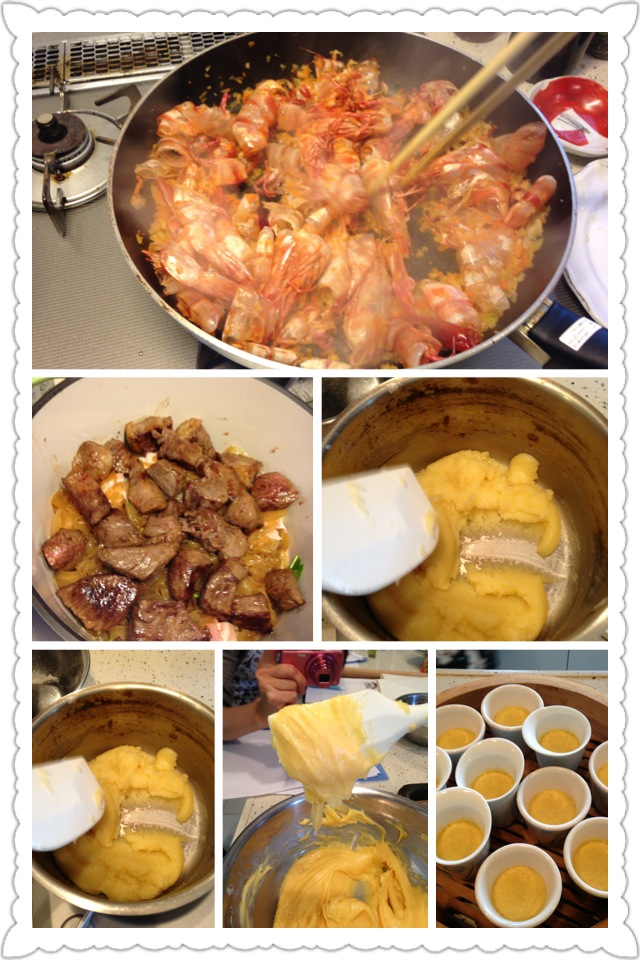 今日は大好きなまいちゃんと一緒だったので、一緒にエビのビスクと、海老、ホタテのポワレキャビア添えに挑戦!大きな海老の殻をらむいて、その殻を香ばしく焼いて出汁をとります☆色々大変な作業でしたが、完成して味見をした時はその美味しさに皆さん感動!殻から出汁をとっただけなのに、まさに海老を食べてるかのような濃厚な味で、このソースだけでメインになりそうなくらい美味しかったです♡