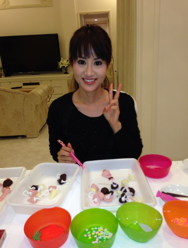 とりあえず私がホワイト、ストロベリー、ブラックのチョコレートを型に流してベース作り!