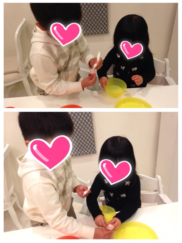 息子に娘がチョコペンをつけてあげてはいどうぞ!娘はアラザンをパラパラして出来上がった指輪チョコをはいお兄ちゃん♡♡♡