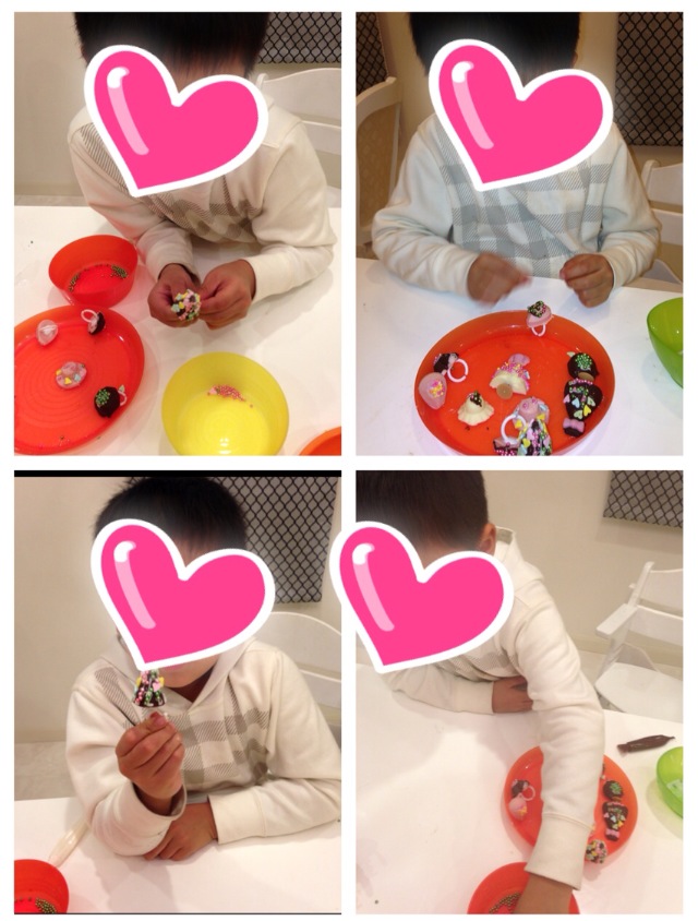 娘はそのうち、アラザンや小さい飾りを食べ始めて遊んでたのですが、息子はもくもくとデコってました♫私はだんだん面倒になって適当にパラパラしてたのですが、息子はひとつひとつ丁寧に作ってて、工作してる感じなんだろうなぁ〜☆私よりずっと上手に仕上げてくれました。みんなでパパにあげようね♡