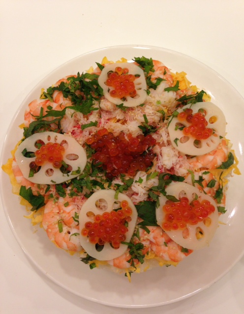 錦糸卵にエビ、カニ、いくらをギッシリのせて、大場を散らしたら見た目がイマイチになってしまいましたが、味は美味しかったです♡