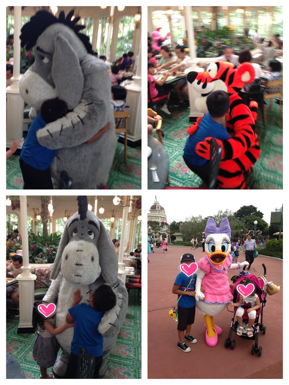 子供達、息子も私もですが、こわい乗り物にまだ乗れないのもあって、どちらかと言うと、ショーやパレードのが喜びます。娘はキャラクターに会えるのが一番嬉しいみたい。二人のキャラクターへのベッタリ具合が可愛いすぎます♡どの子達にも思いっきり抱きついてます☆