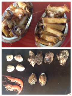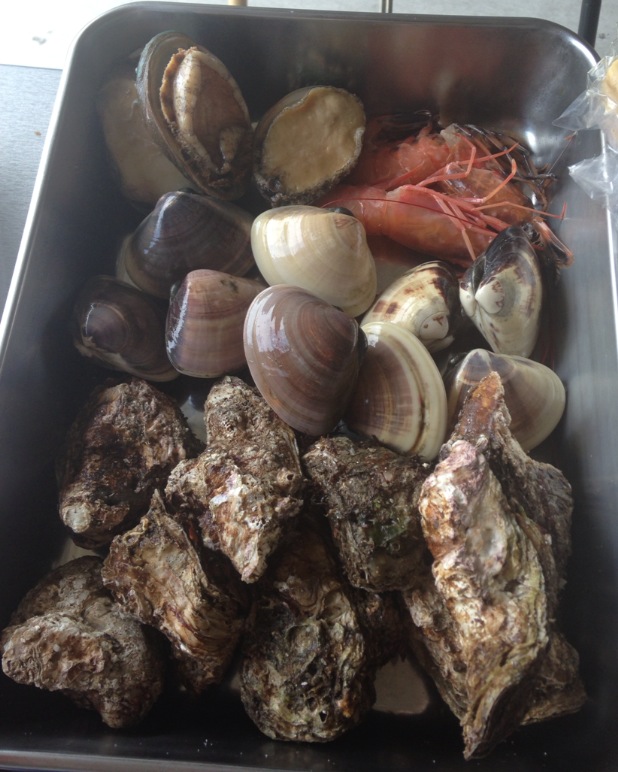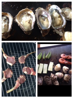 国産の大きな蛤、岩ガキ、エビ、ズッキーニなどのお野菜や、ステーキ☆