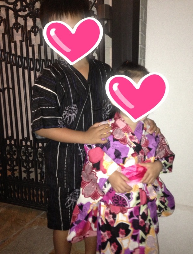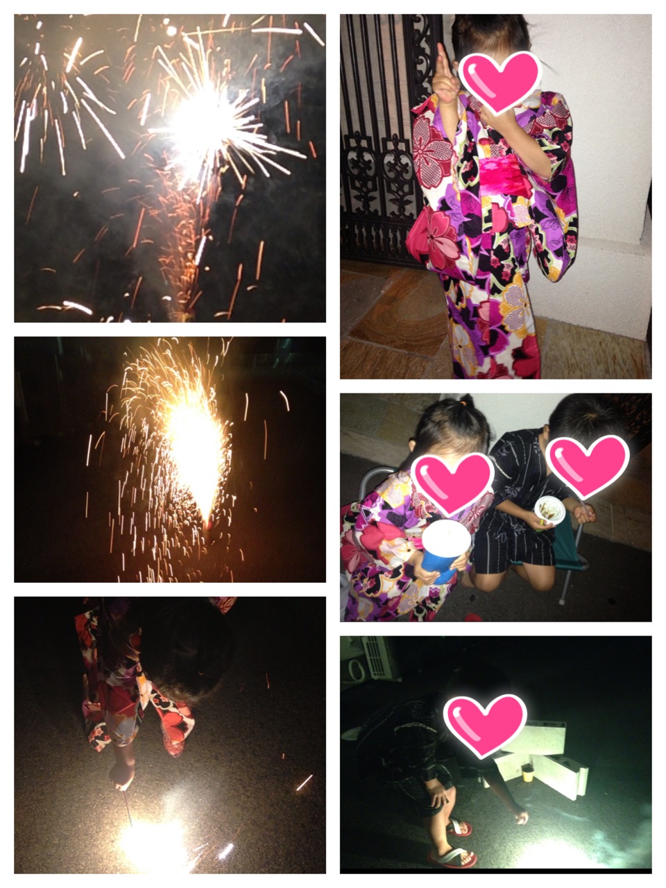 浴衣のお写真、5分のスピード着替えに花火後で娘を抱いたりで着崩れてしまってます(笑)