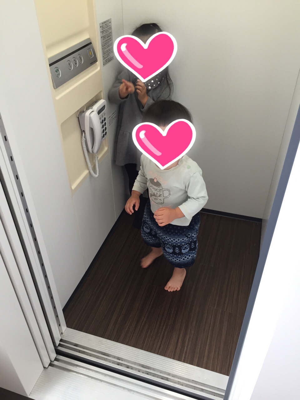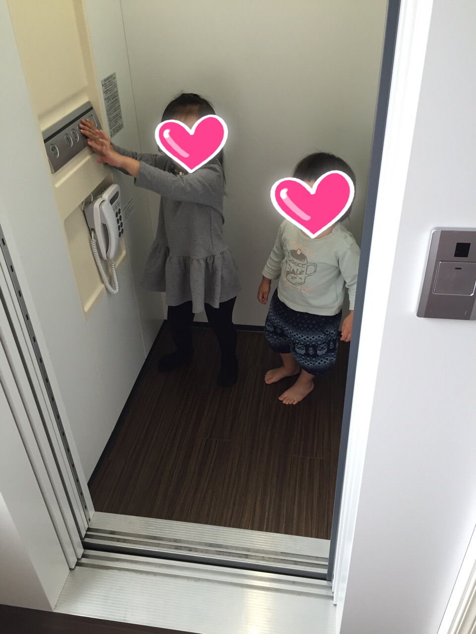帰り際、子供部屋で遊んで呼んでもなかなか下りて来ないと思ったら、子供達がもっと遊びたくて、エレベーターに乗って逃げて回ってました(笑)エレベーターもいつの間にか一人で乗れるようになってます。