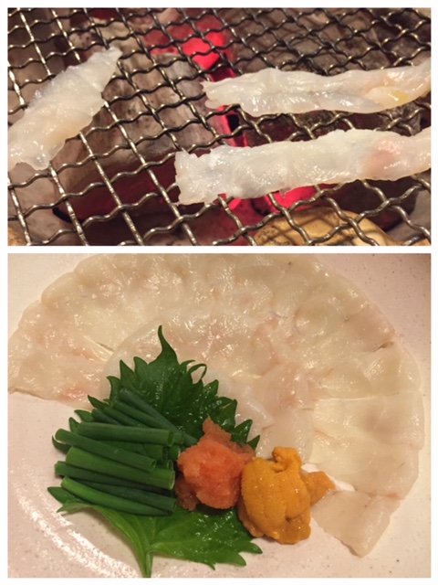 厚切り河豚の炭火焼き雲丹添え こちらは厚めに切ってあって、焼いても生でも大丈夫!