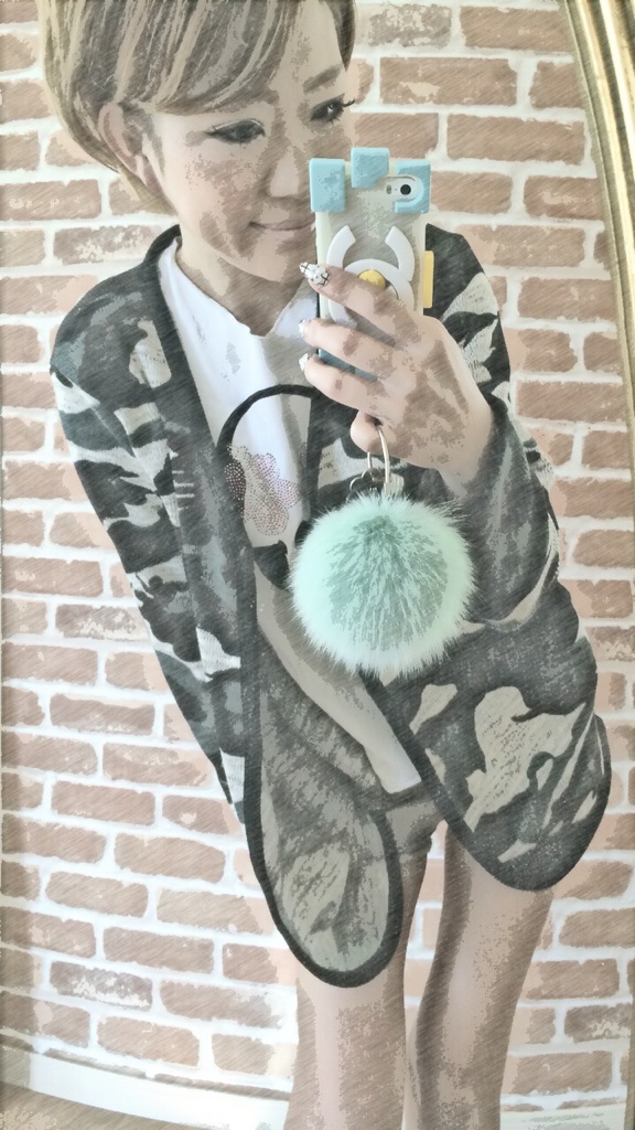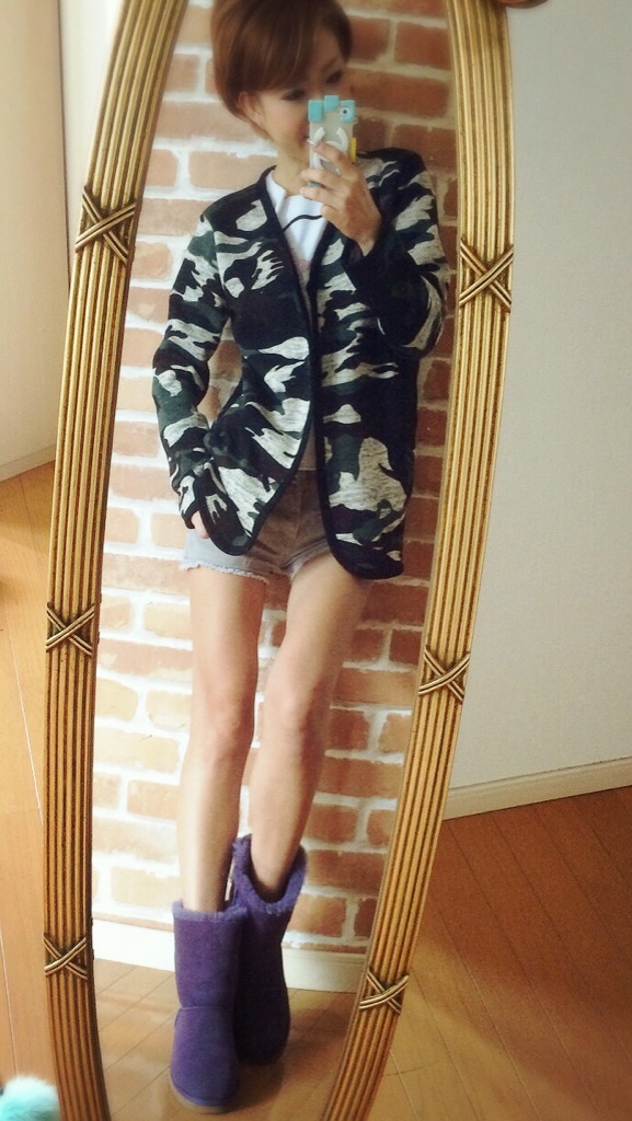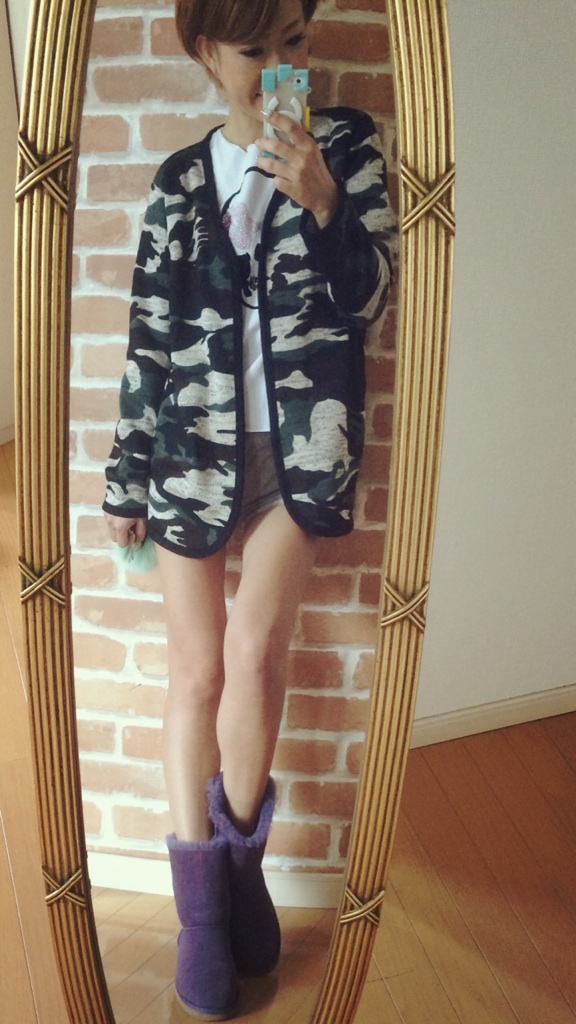 コーディネート 2014.10.06 今日は、台風警報が発令! 午前中には解除されたので、 午後から学校だった子ども達。 解除されても、まだまだ風が強かったので、送りに行きました。 そんな今日のコーディネートは、ラフ!! ショートパンツに、アグブーツ。 半袖Tシャツだと寒いので、 ロリーズのカモフラJKを。 カジュアルスタイル大好きです。