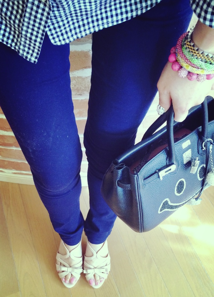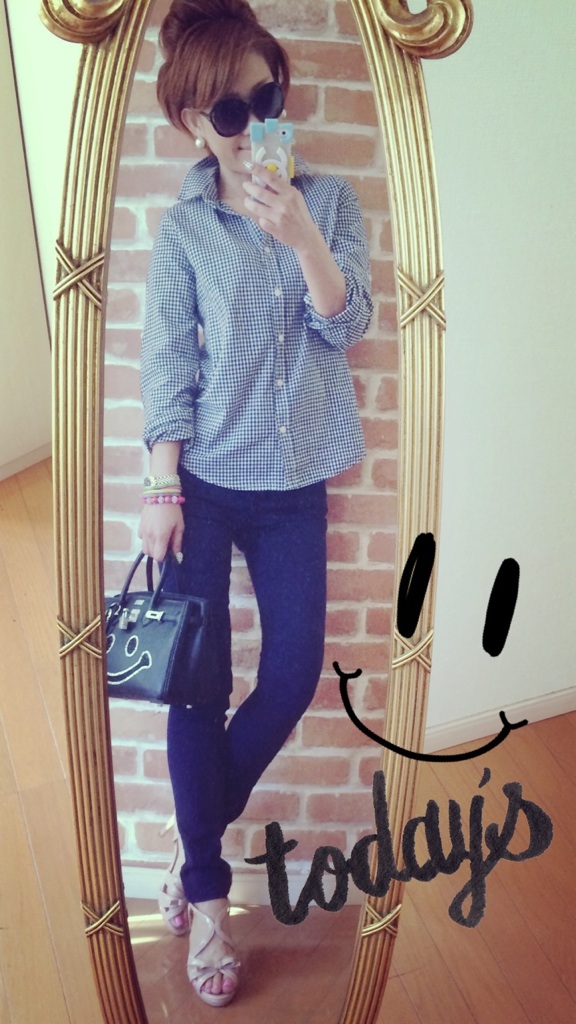 リュックサック 2014.10.08 今日から修学旅行の息子。 小さめのリュックサックを急遽!購入。 しかも、スーパーの二階で購入しました。笑 スーパーにリュックサックを買いに行った時のコーディネート。 ネイビーのスキニー、ギンガムチェックシャツ! ラフカジュアル!! 足元は、サンダルという。。 なかなか今の季節は夏と秋のファッションがごちゃまぜ?!