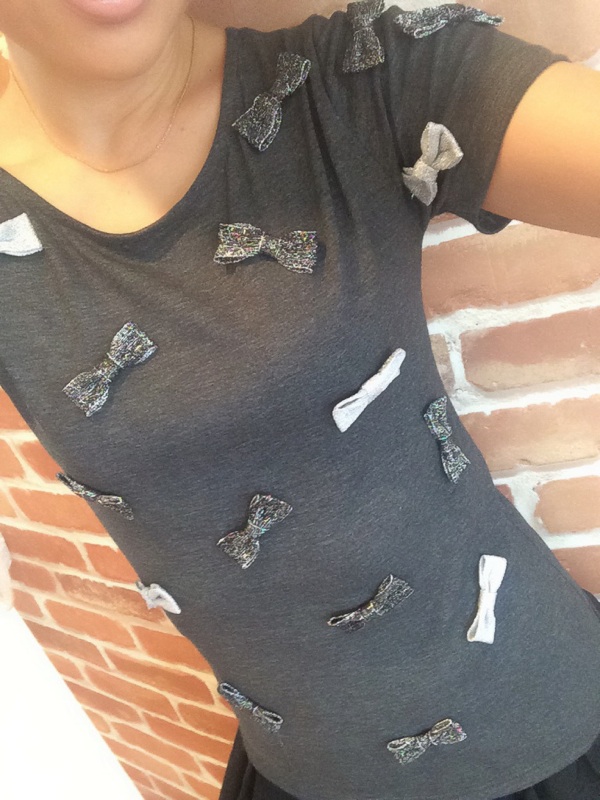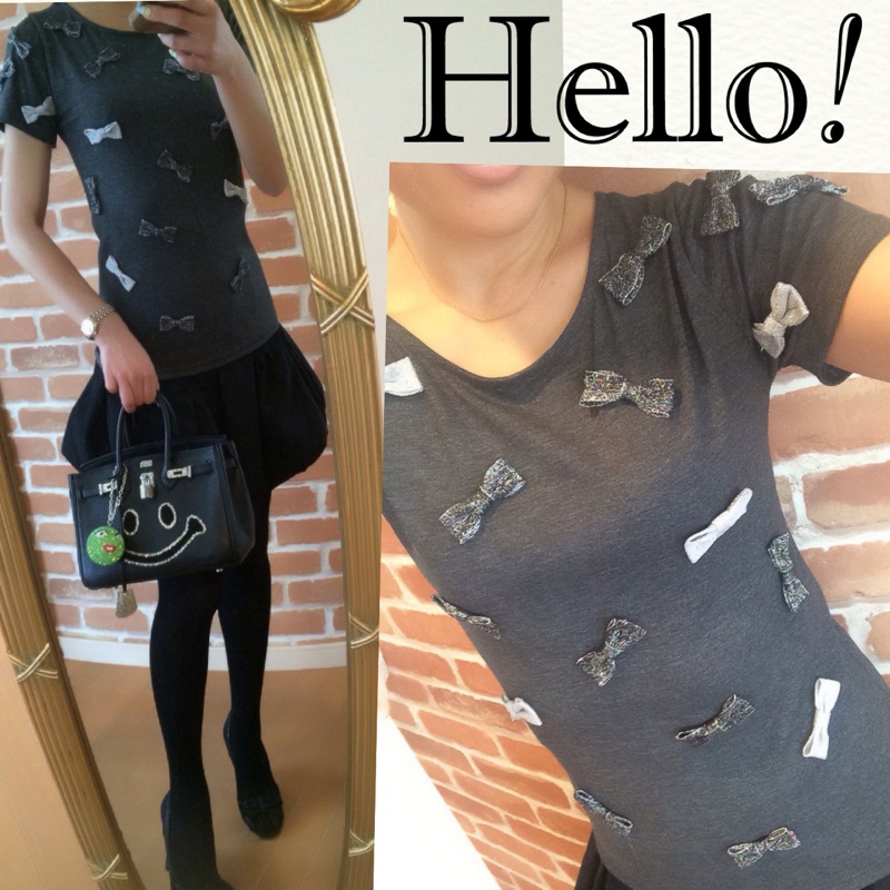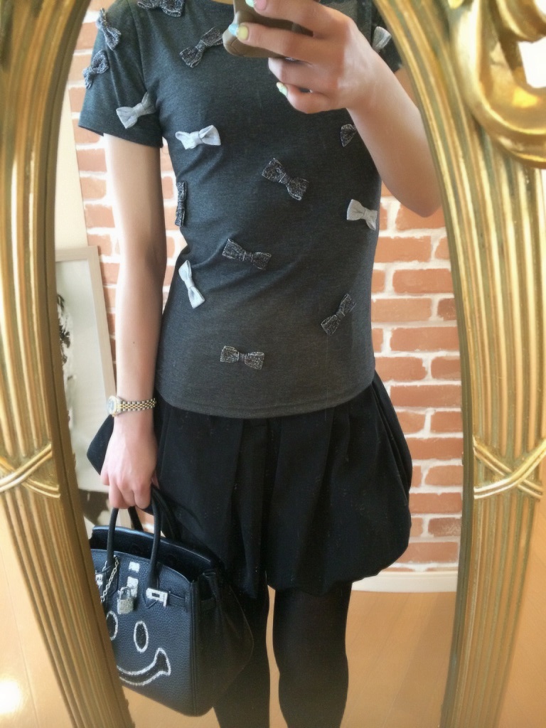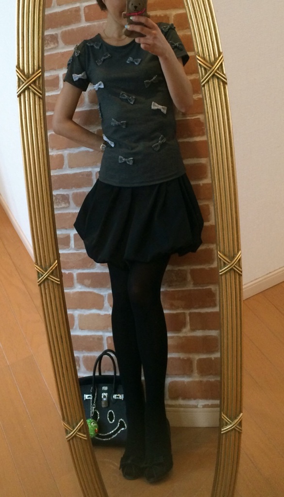 コーディネート〓 2015.03.10 いくつになっても、りぼんが好きなわたし。 昨日のコーディネートは、ロリーズのラメりぼんTシャツに、バルーンスカートコーディネート。 週に1度のプラセンタ注射の日でしたので、腕の上に打ちやすい半袖Tシャツ! 甘過ぎないように、バッグで辛め?に。笑 何が辛めか??笑 辛め顔!笑 バッグチャームも春夏にチェンジ!