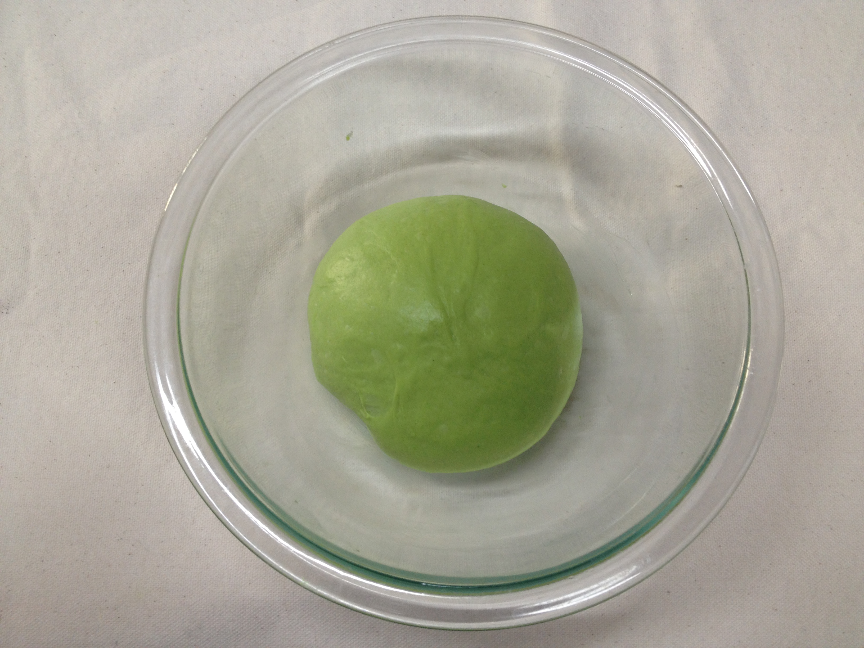 鮮やかなグリーンになった大麦若葉入りの生地を作るところから始めました。
