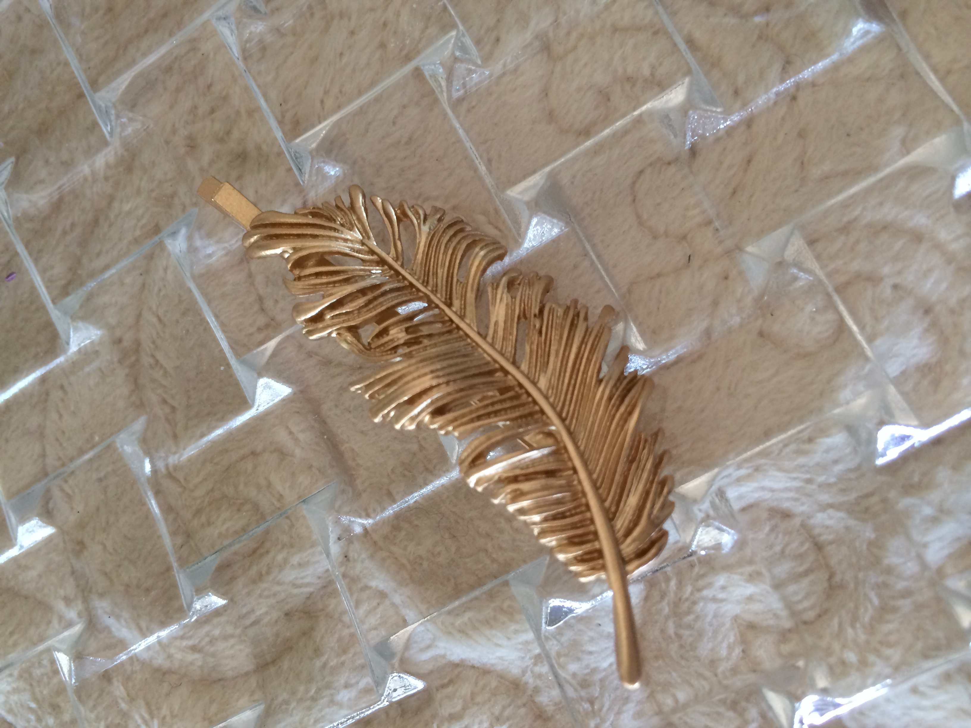1000円でも見極めとセンス 2015.06.17 見つけました。 アップした髪にさりげなくつけたいピン。 先日、映画☆シンデレラを観てきたのですが、 おとぎ話の世界に浸り、気分良く帰ってきた時に ピンを見て息子が一言・・・・「これって、水草??」 「えっ???」 仕方がない、、、、理科の教科書見てたら、感覚的に見えちゃうか、、、、 わかる人にしか伝わらないセンス。 フェザーなのに。。。。。 マットなゴールドに繊細なフェザーの感じが優しく出ています。 水草ではありませんよ~。 プチプラ☆1000円。