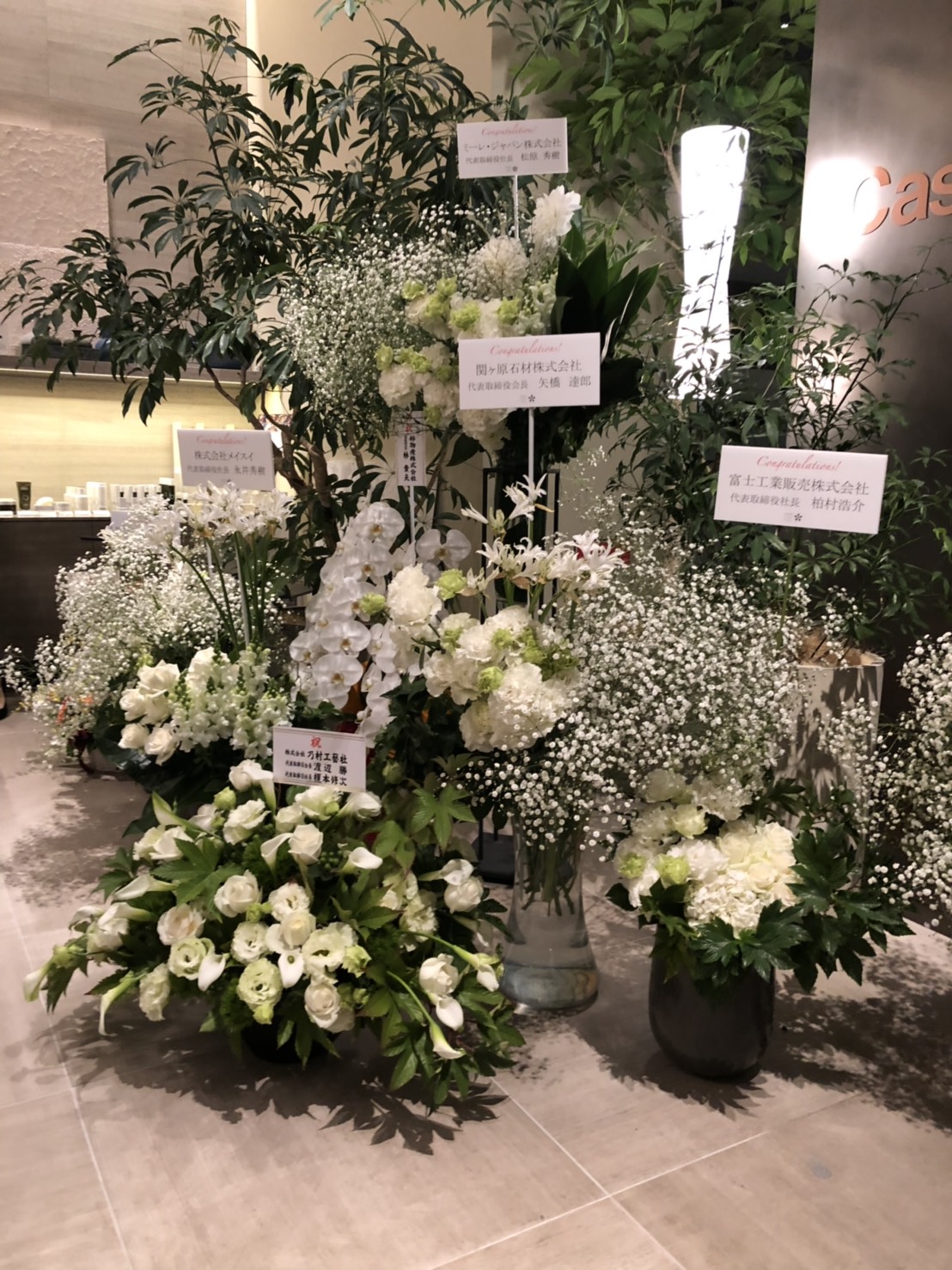 お祝いのお花もたくさんで 白と緑を基調とした