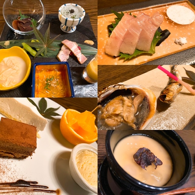 先付の自家製湯葉、ところてん、知多の木耳、燻製肉、春雨からのお造りは昆布じめ、大アサリとイワシ、トリュフの茶碗蒸し、そしてデザートも4品盛り!!!