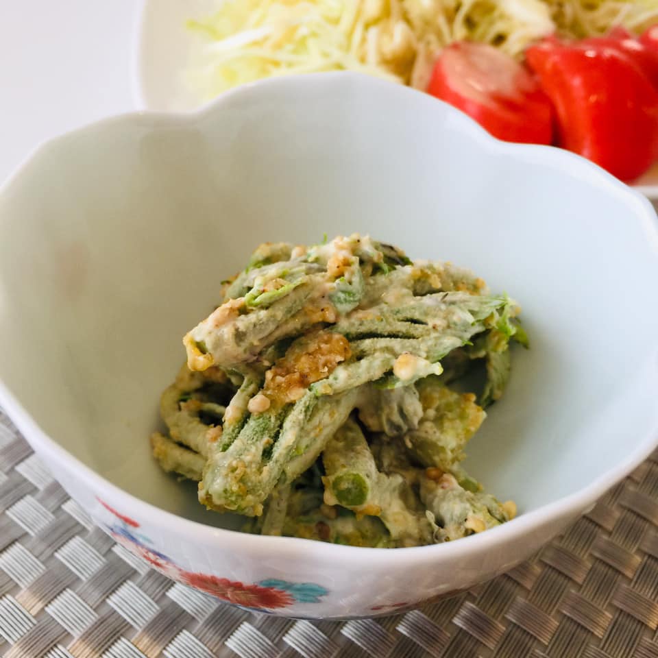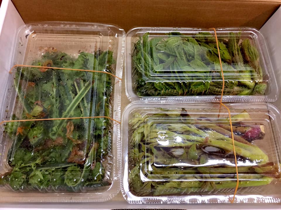 コゴミは炊いて、タラの芽は胡麻マヨネーズ和えに。