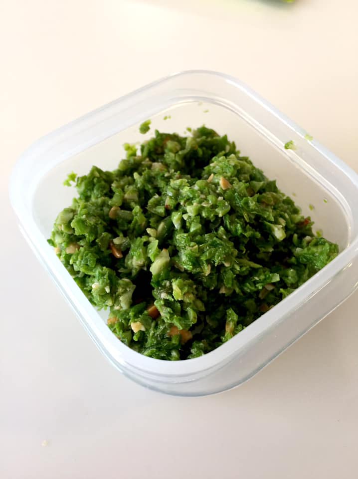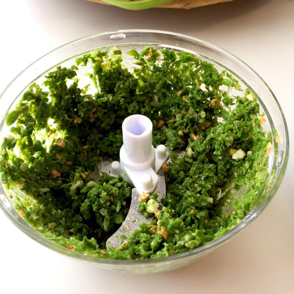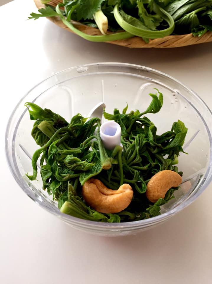 さっと湯がいて氷水に浸してアク抜きしたら、カシューナッツとニンニクとオリーブオイルでミキサー。