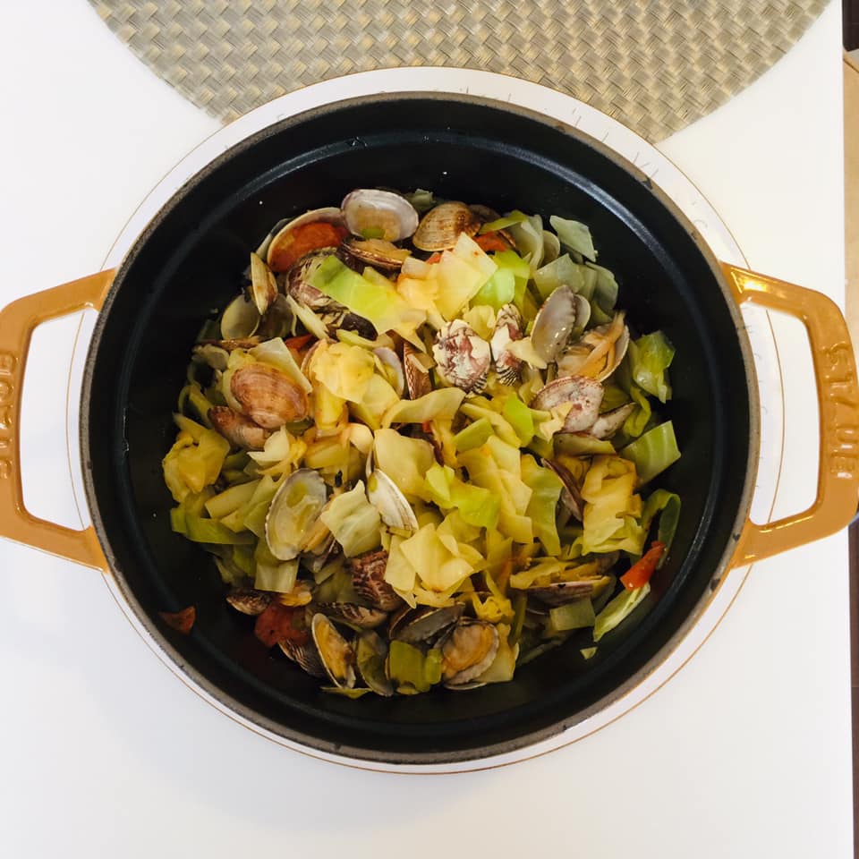 偶然同じ日に頂いた、内海のあさりは春キャベツと蒸し焼き