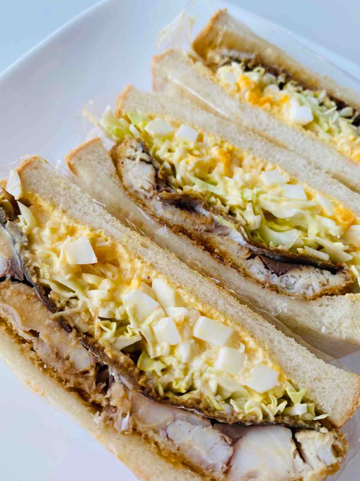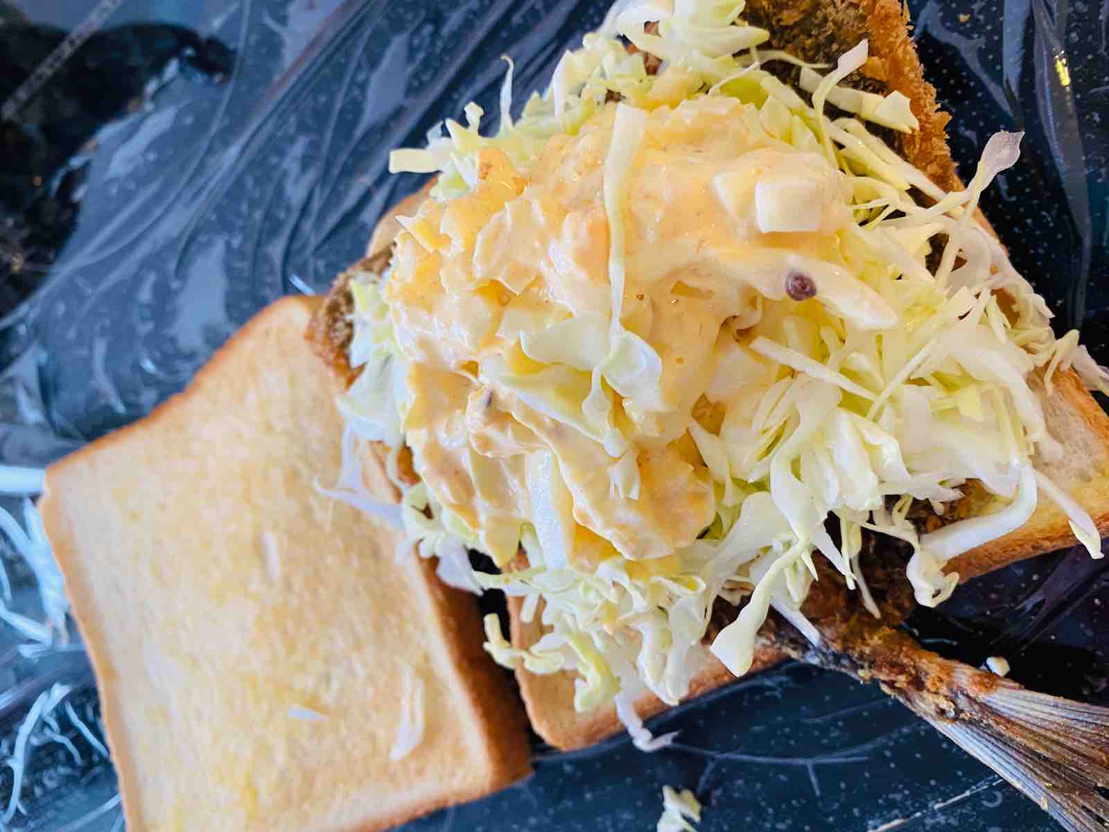 軽くトーストしたパンに薄くバターを塗って、アジフライを乗せたら、キャベツの千切りと自家製タルタルソースをたっぷり。