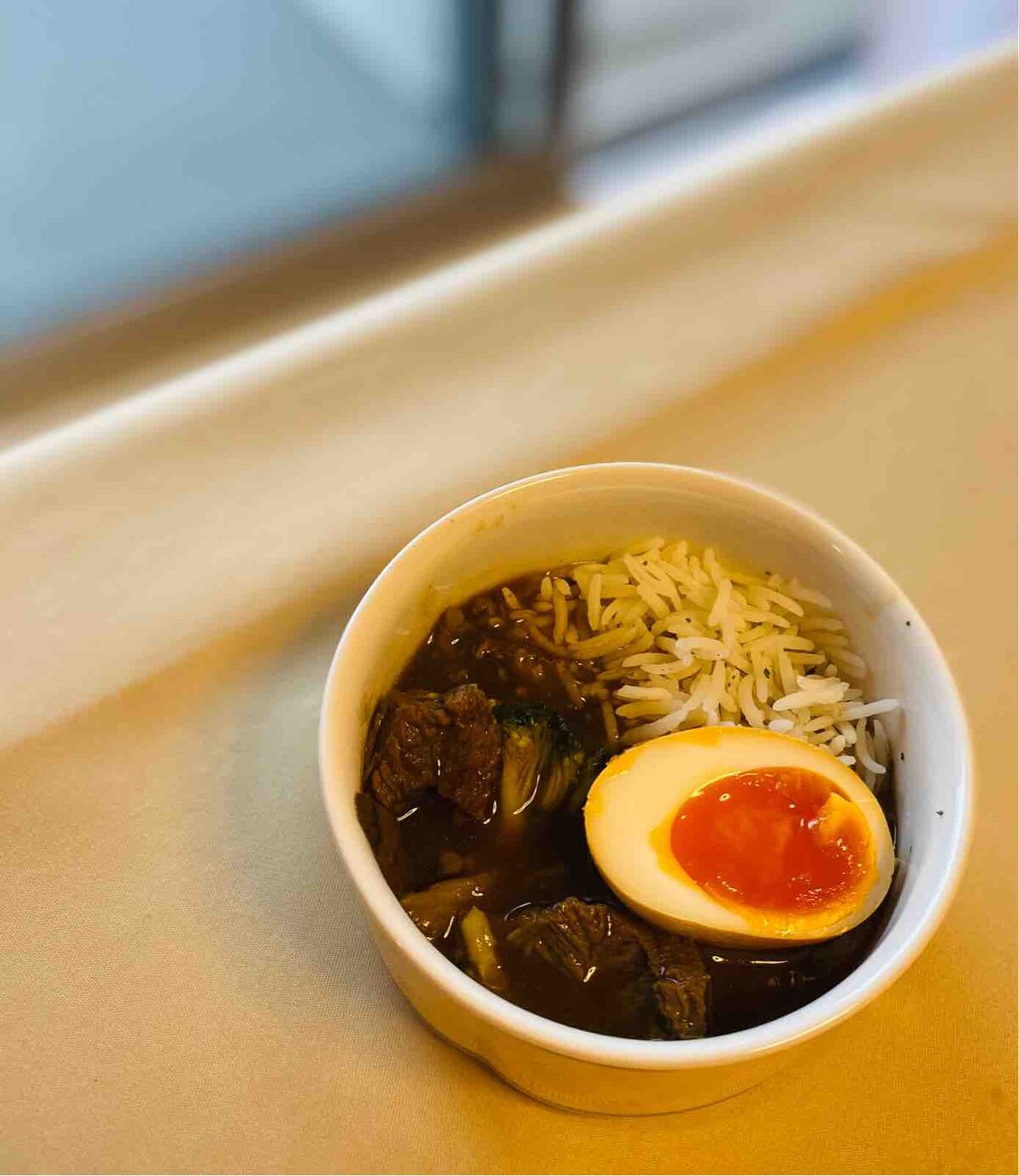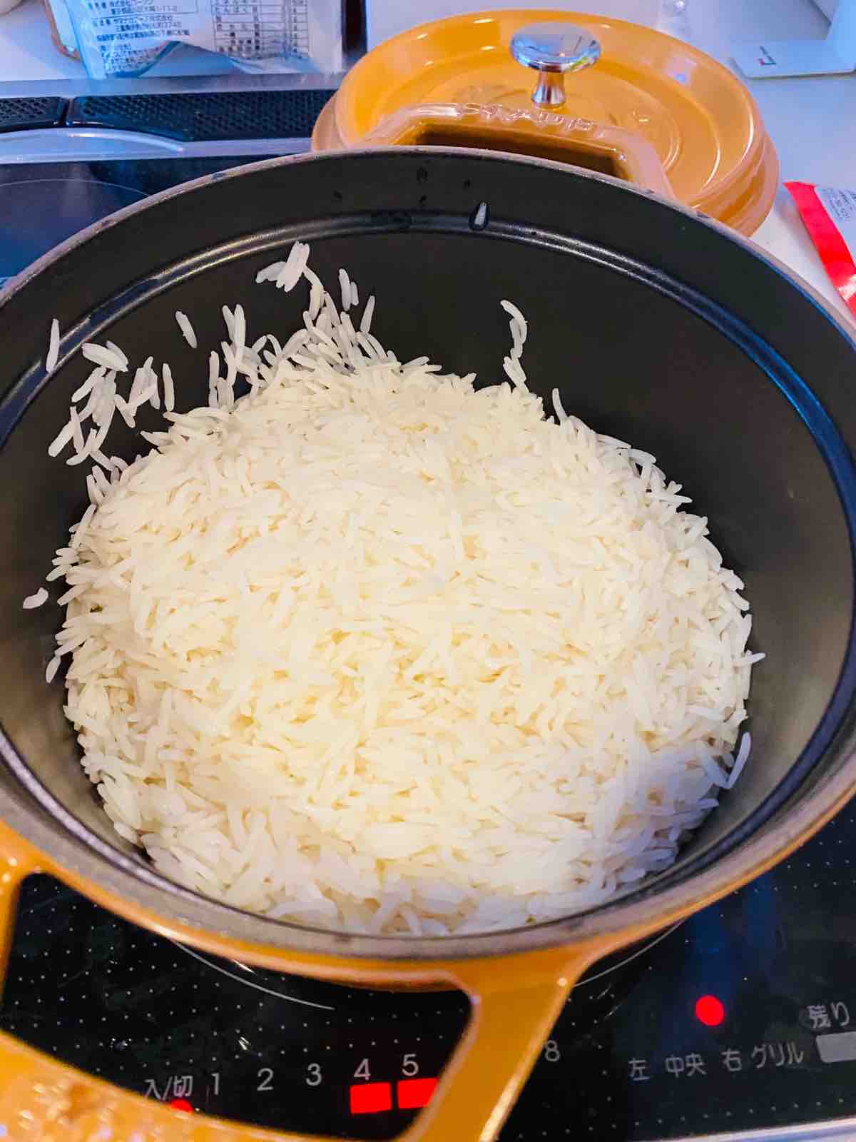 添えるご飯のバスマティーライスは、本場っぽく炊くんじゃなくて茹でこぼしてから蒸らして。