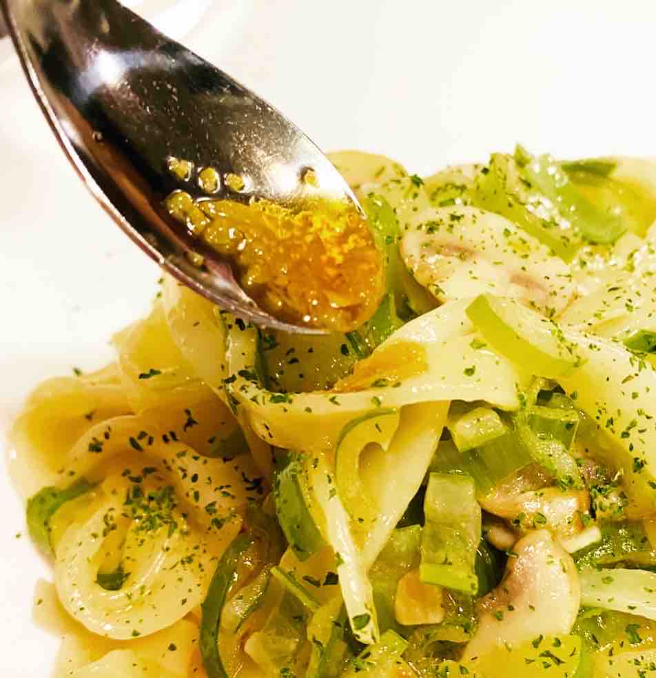 まず、シートを細長く切って3分ほど茹でてパスタを作り。出雲NORAブランドの特製ラー油とニンニクをオリーブオイルでじっくり加熱して、「ペペロンチーノ」に!