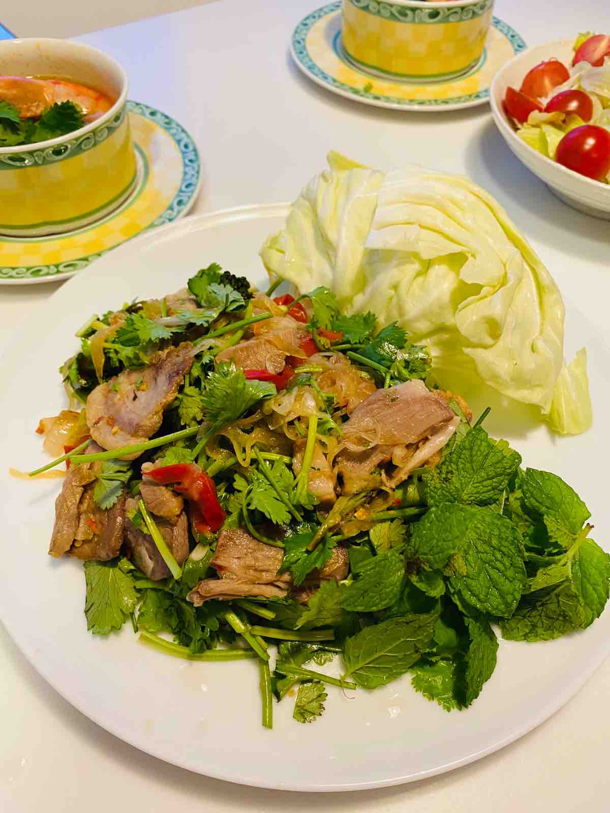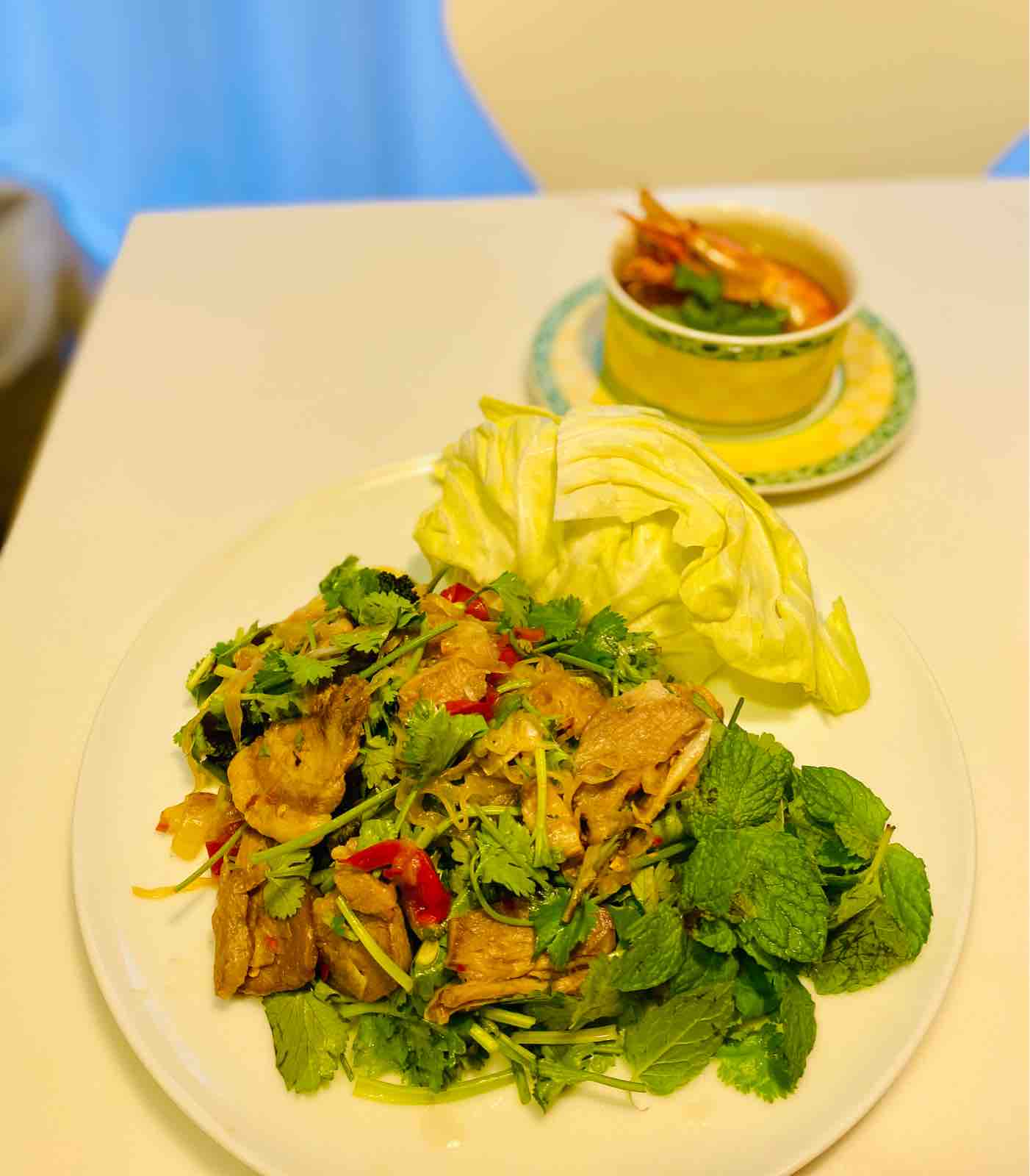 お箸で手早く混ぜたら、更に切ったパクチーをたっぷり加えて今度は手で混ぜ混ぜ…ナンプラーとポッカのレモン汁と刻み唐辛子、そして潰した白玉麩の粉で味を整えたらお皿に盛り付け。生キャベツとミントの葉っぱを添えれば完成!