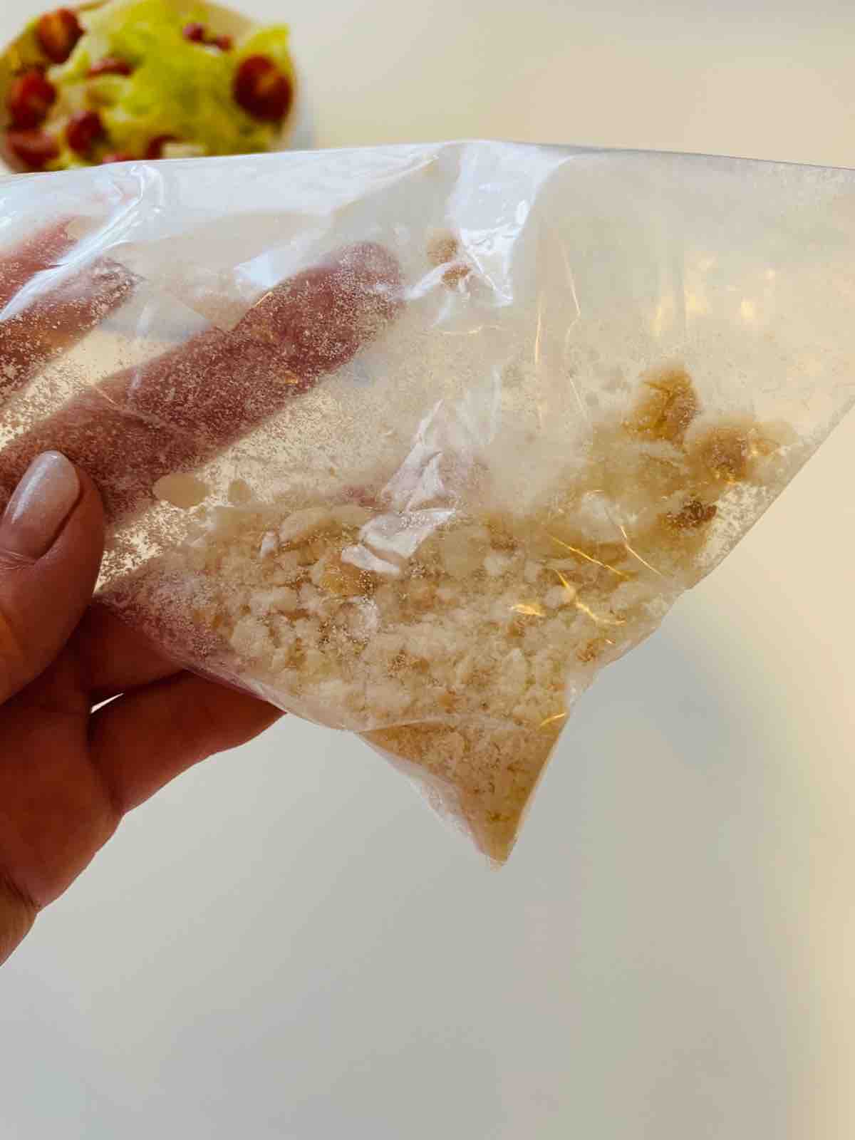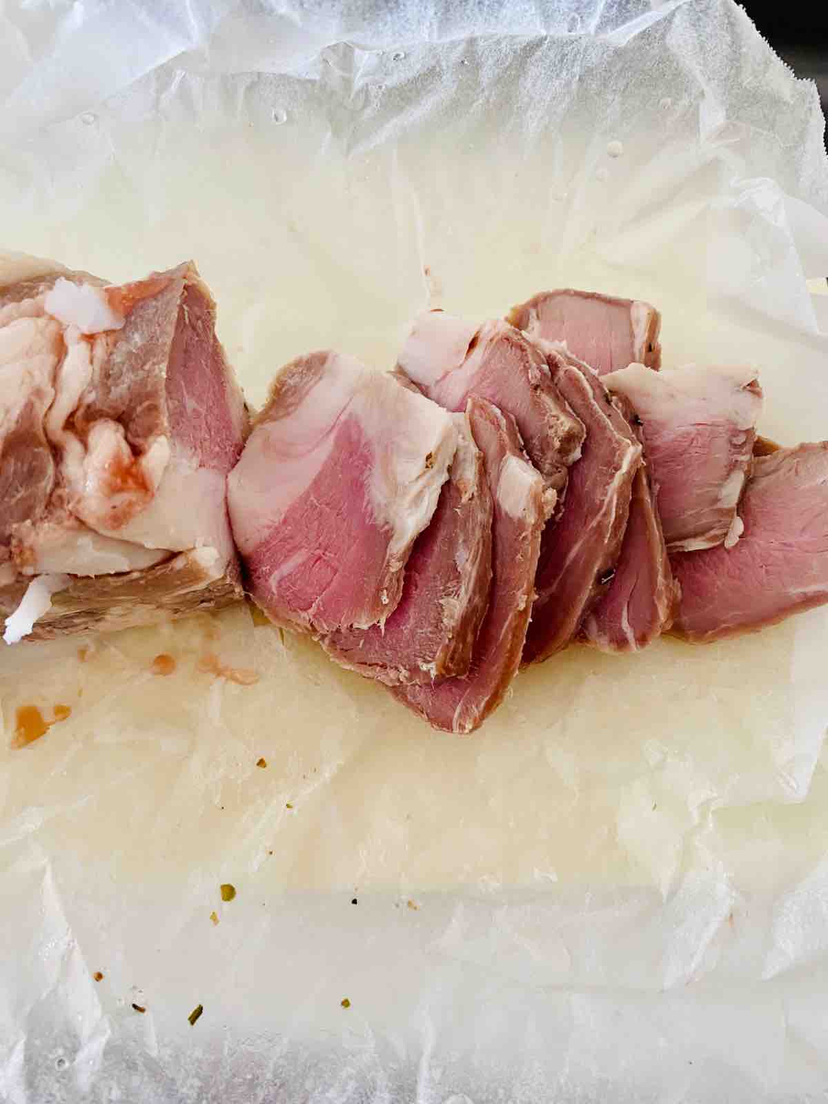 大きめのボウルに、スライスした新玉ねぎを入れ、その上に薄切りしたローストポークをサッと炙って入れていきます。