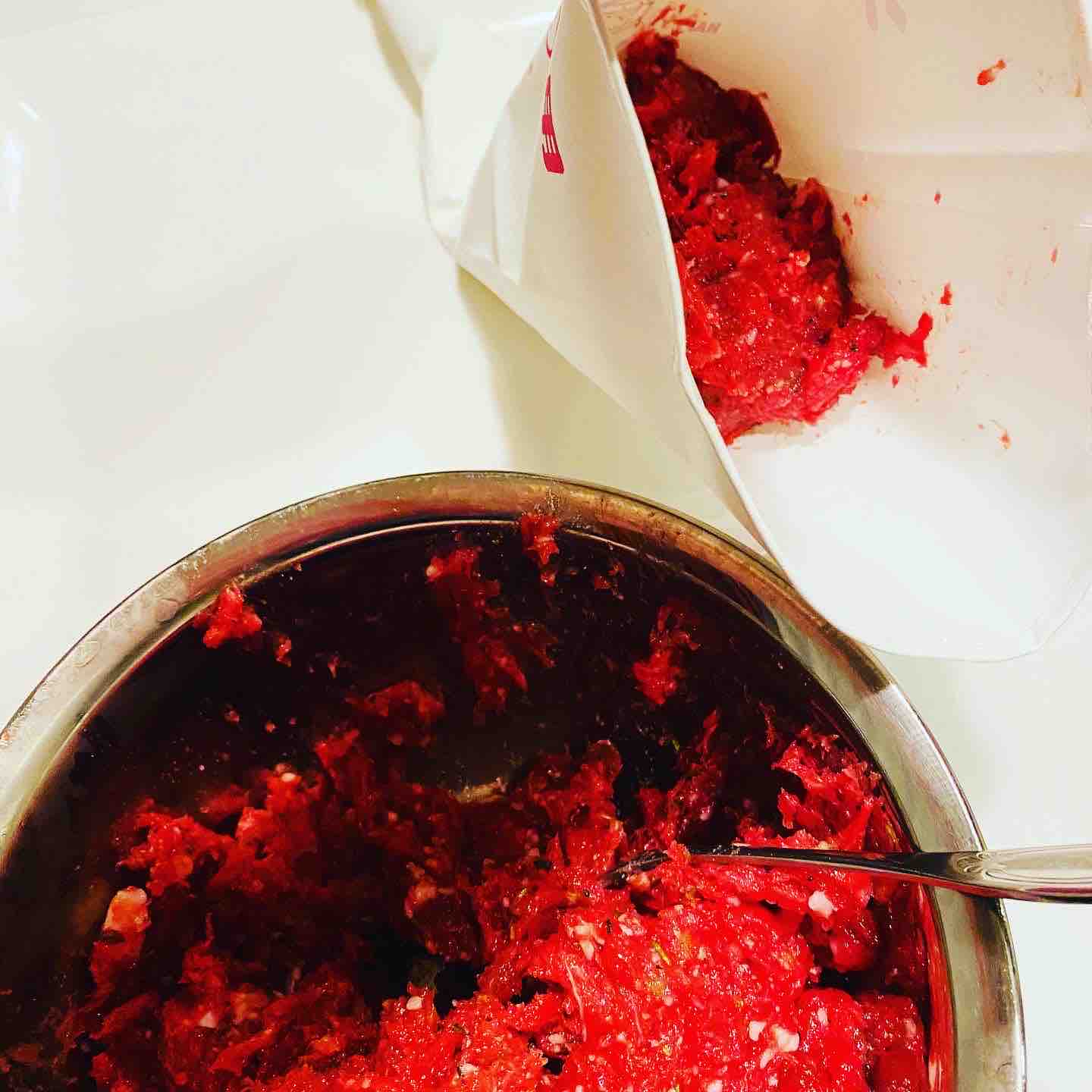 早朝から筋切りした赤身肉を冷やし、牛脂・調味料・ハーブ、そして氷水と一緒にミキサー。ここで、しっかりエマルジョンにします。