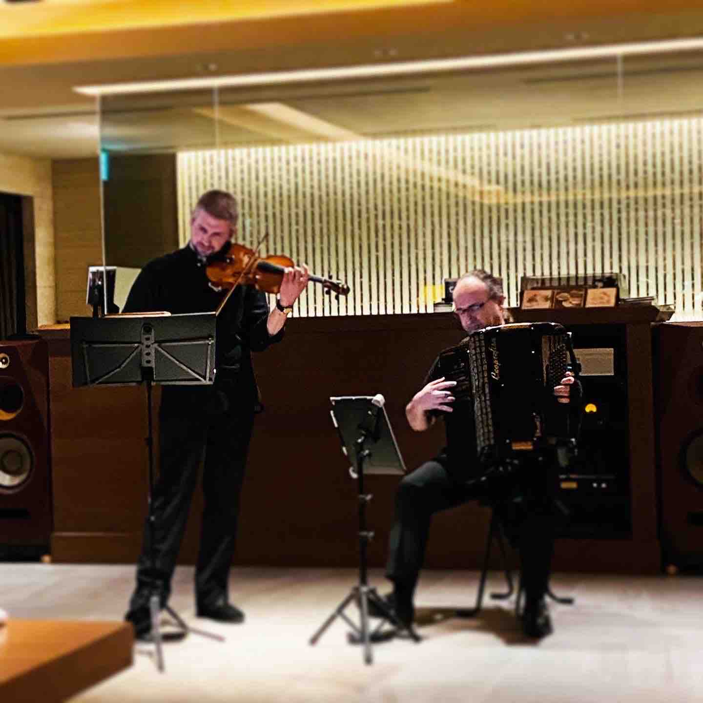 眼下に広がる名古屋の夜景とバイオリン&アコーディオンデュオの生演奏。