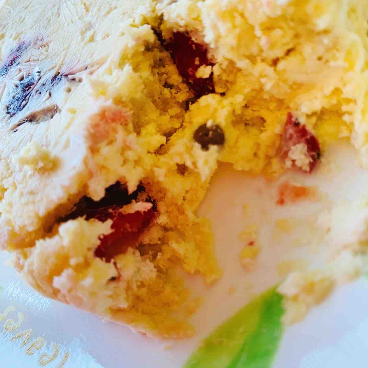 更に残ったケーキは、ボウルの中でイチゴごと、フォークでぐちゃぐちゃに潰して型代りのタッパーにキツキツに詰めて冷凍庫で凍らせると、こんな丸い冷たいデザートに変身。