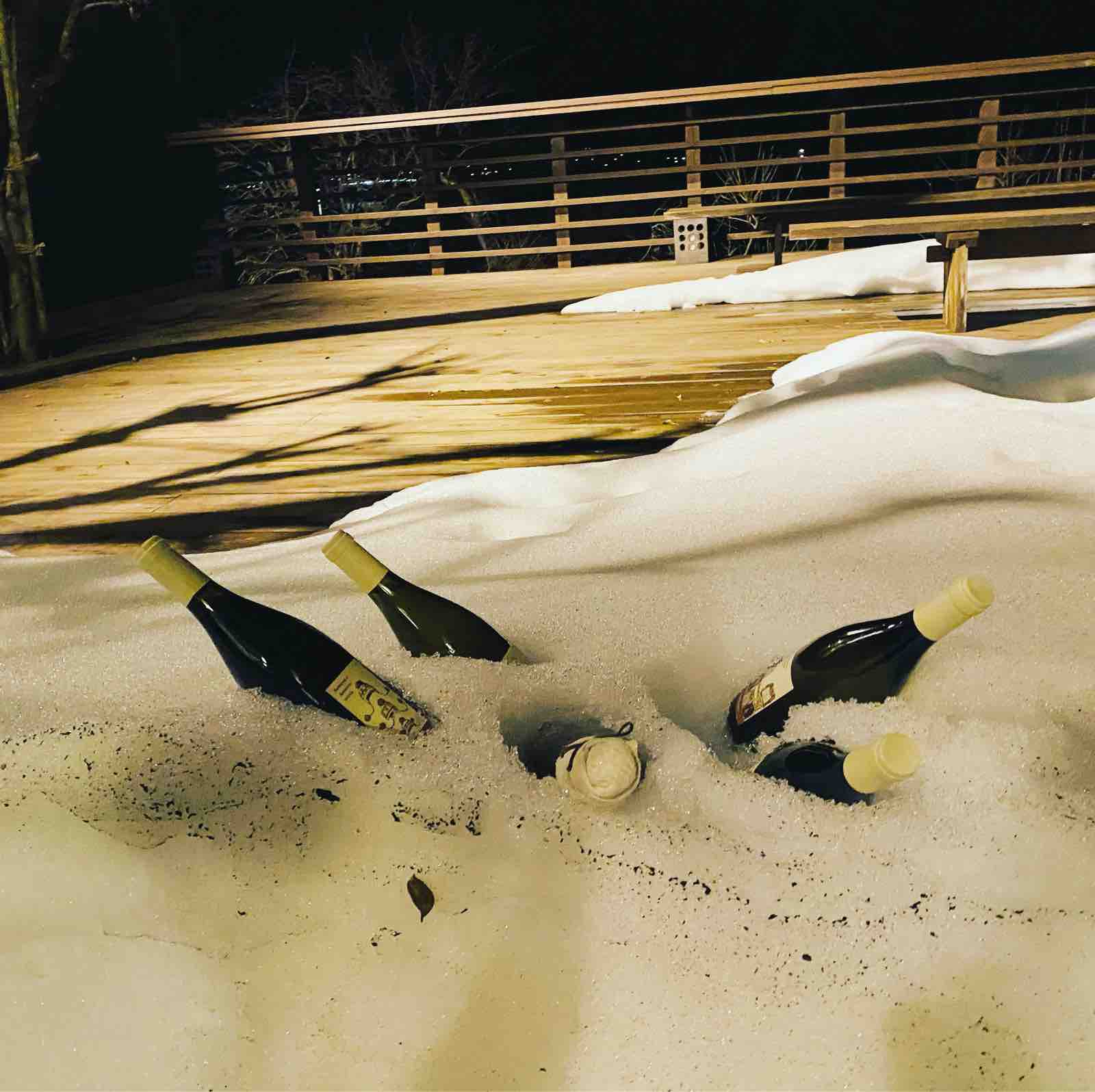この季節の宿泊は楽しみ満載。だって雪深い山のオーベルジュですもの、着いたらすぐにワインを雪の中にズボズボ