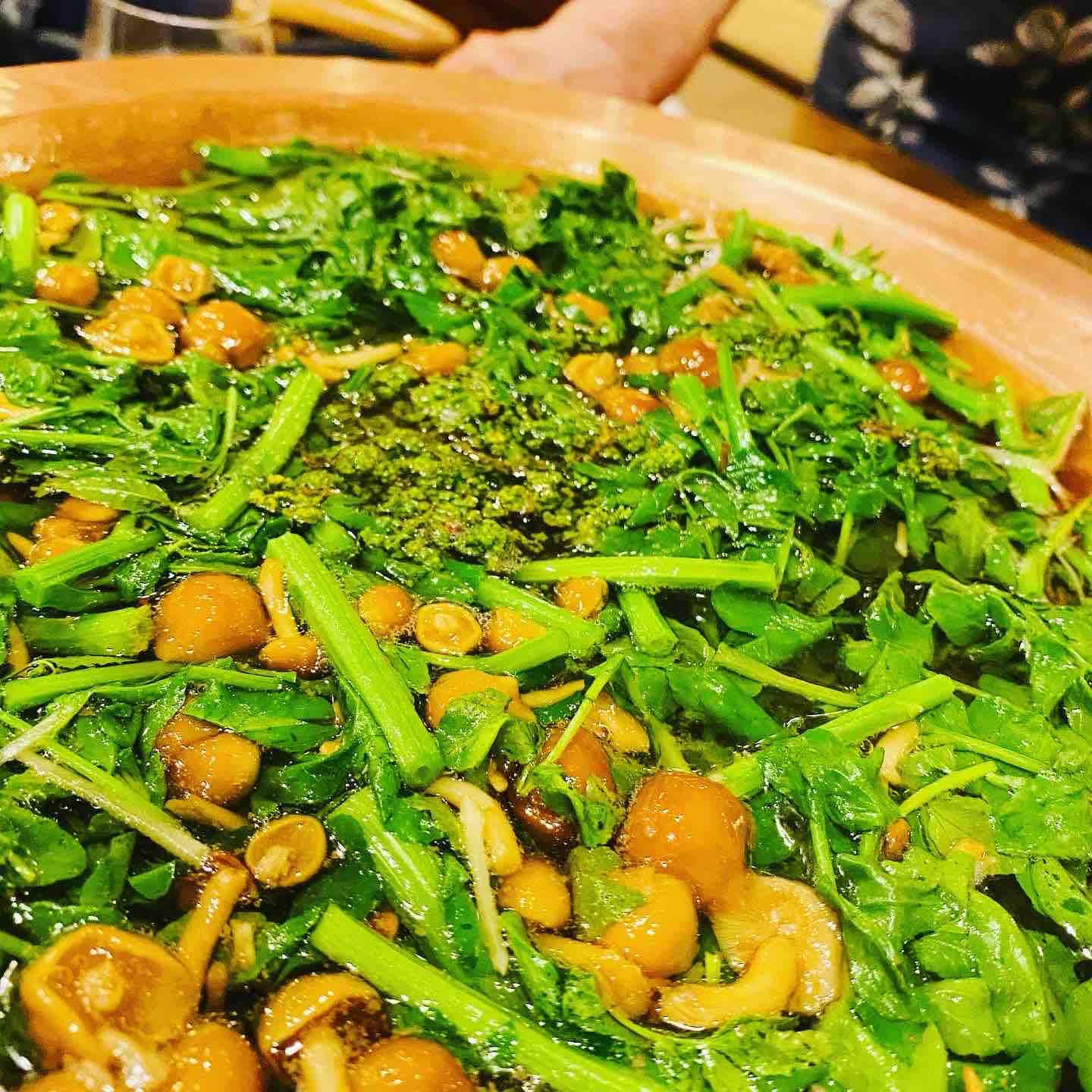 しめの鍋は、春のうちに冷凍してあった花山椒もたっぷりの山の緑鍋。