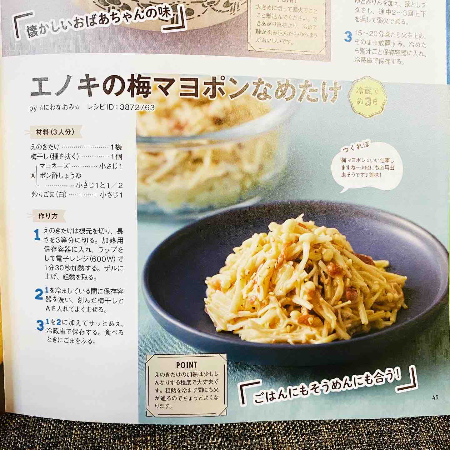 現在発売中の「クックパッドの作りおきおかず・最新版」の野菜部門に、『エノキの梅マヨポンなめたけ』が載っています。
