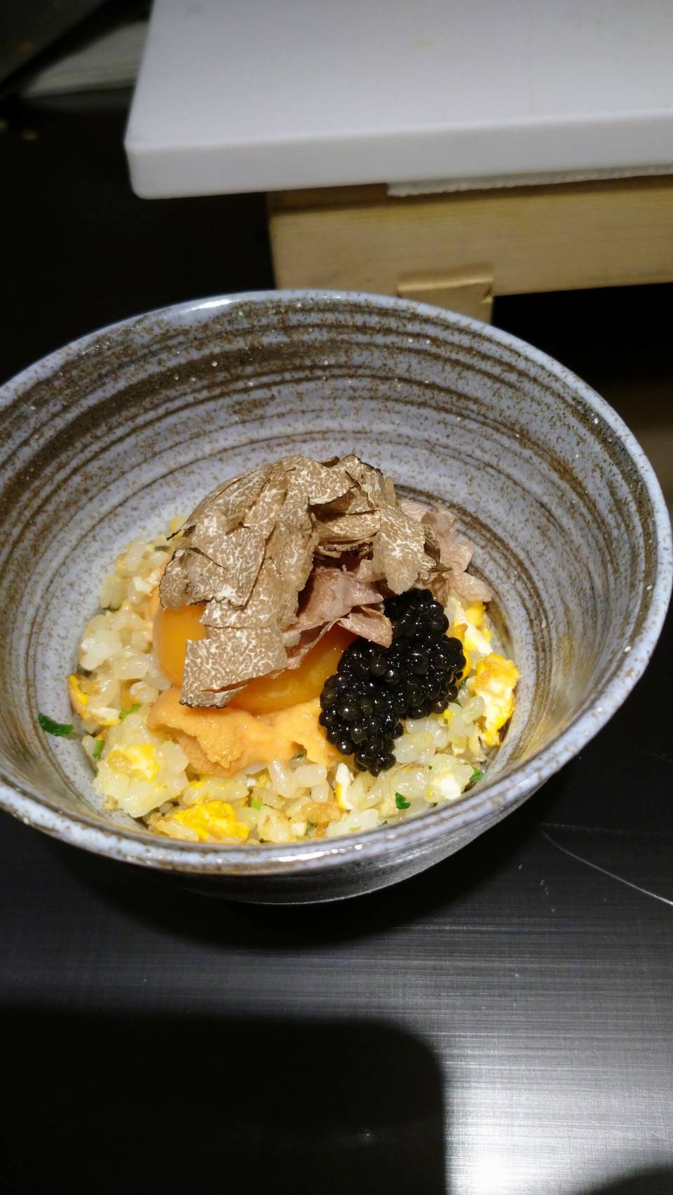 〆は、名古屋コーチンの黄身に、ウニ、キャビア、トリフの卵かけごはん