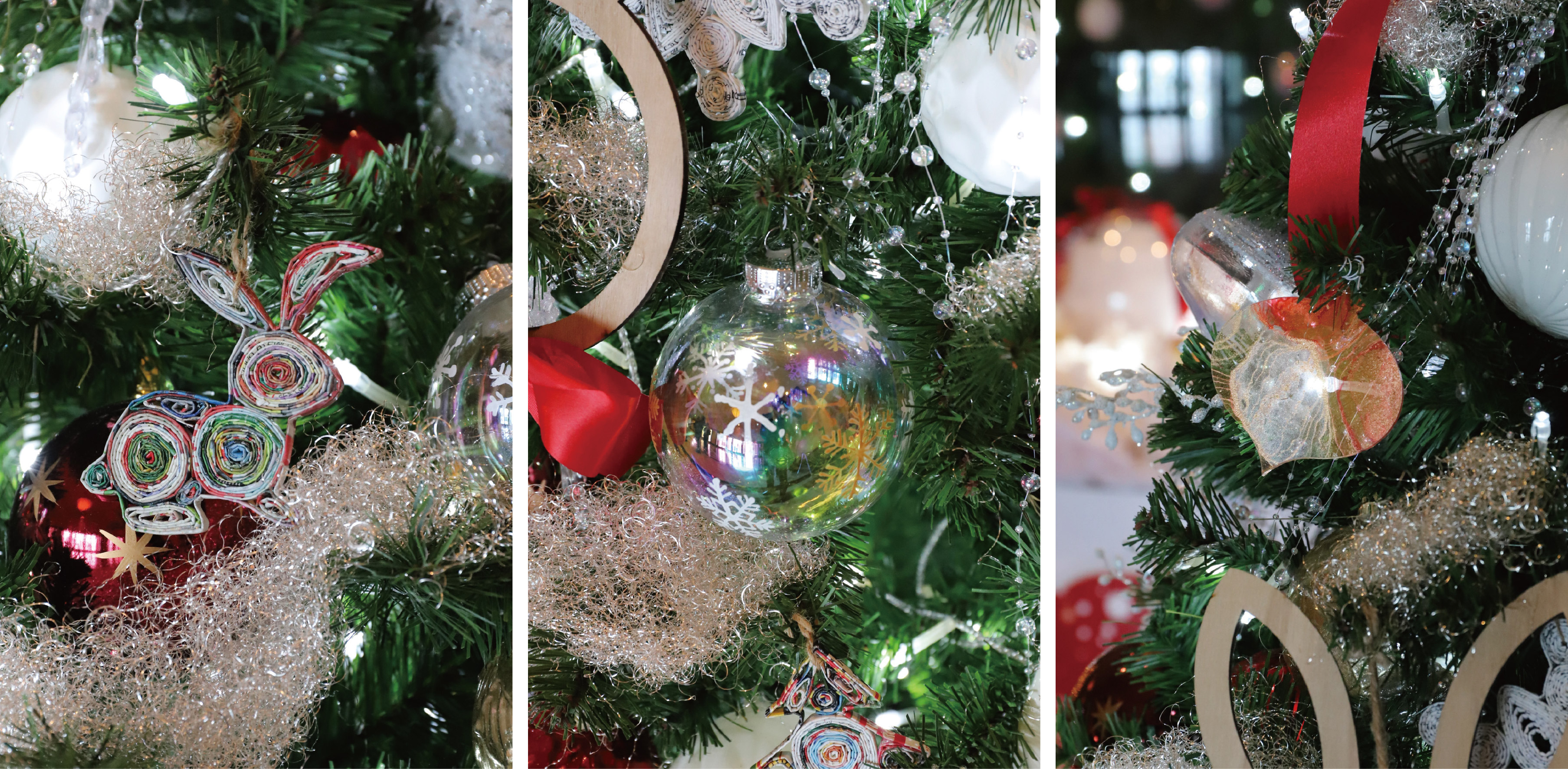 クリスマスツリーに飾られている装飾の中には、コロナ禍で使われた飛沫パネルや古紙、リサイクルウッドを使用し作られたオーナメントも。