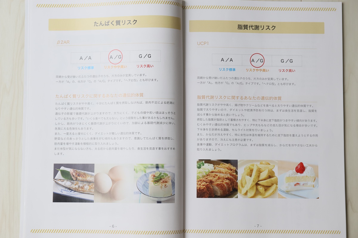 遺伝的体質から見る‟あなたに適した食生活”と、遺伝的に適した‟運動・生活改善”の2つを軸にライフスタイルの改善を提案してくれます。「糖代謝リスクよりも脂質代謝リスク対策を優先し、糖質よりも脂質の多い食事から減らすことがおすすめ。また、揚げ物やクリームな脂質の多いものを減らしたり、茹でる、焼くなどの調理法は素材についている脂質を減らす効果も。スープなどの汁物や野菜などの食物繊維を先に食べるのも良い」とのことで、今後の生活で意識したほうが良いことが具体的で、実践するにあたり、イメージしやすい内容に。