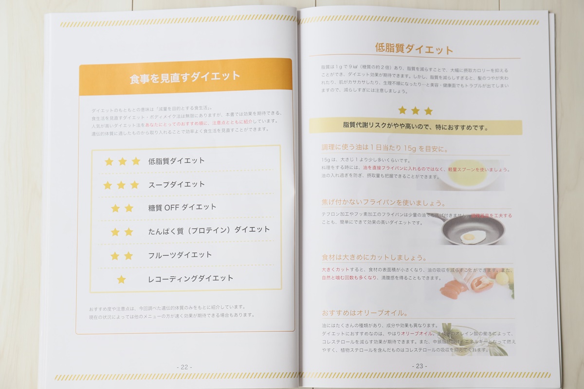 また、食事を見直す際に意識すべき点も記載。食事については、自分に合ったおすすめのダイエット法順に紹介。この中から、継続できそうなダイエット法を見つけるのも◎。